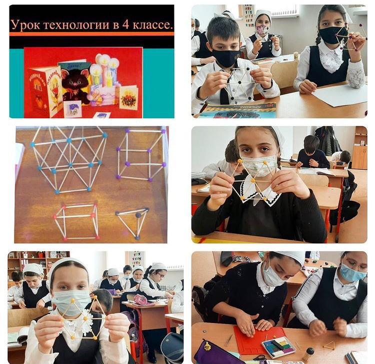 Урок технологии в 4 "а" классе. Учитель-Нанаева С.О. Цель урока: создать условия для знакомства с понятиями, относящимися к объемным геометричнским фигурам: "вершина", "ребро"; способствовать формированию умений осуществлять подбор материалов для изготовления моделей объемных геометрических фигур; содействовать развитию навыков изготовления геометричечких форм из зубочисток с их закреплением в углах с помощью пластилина. Дети активно работали, проявили творческий подход к выполнению фигур.