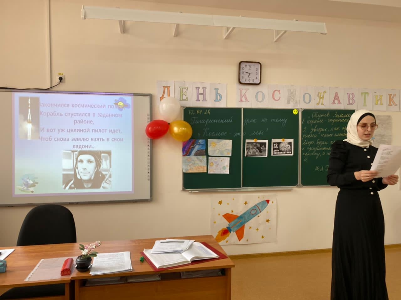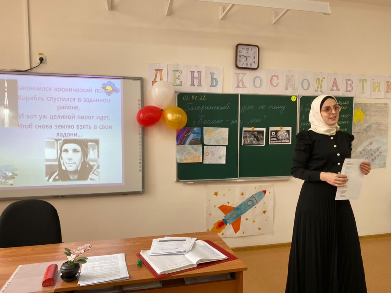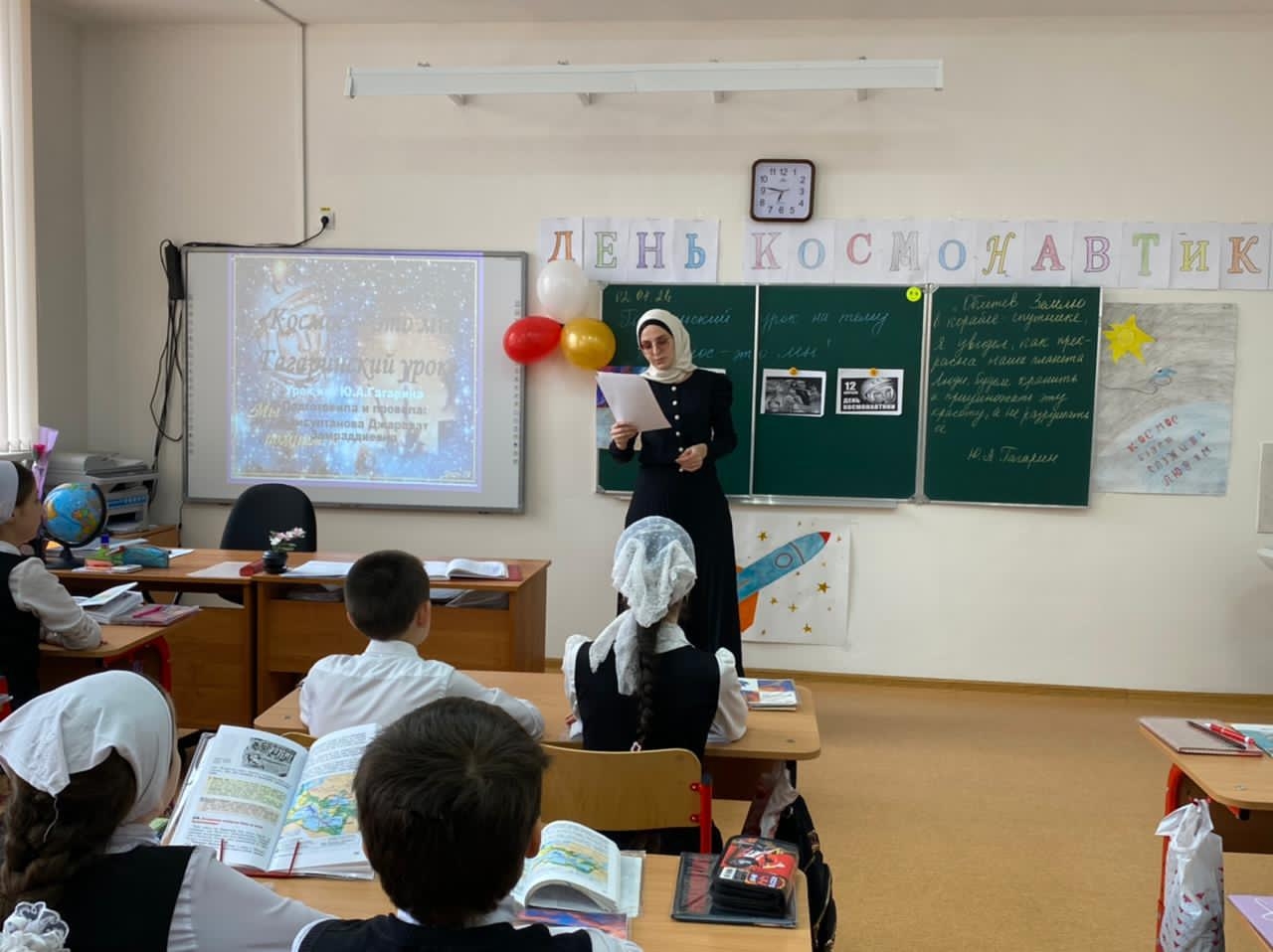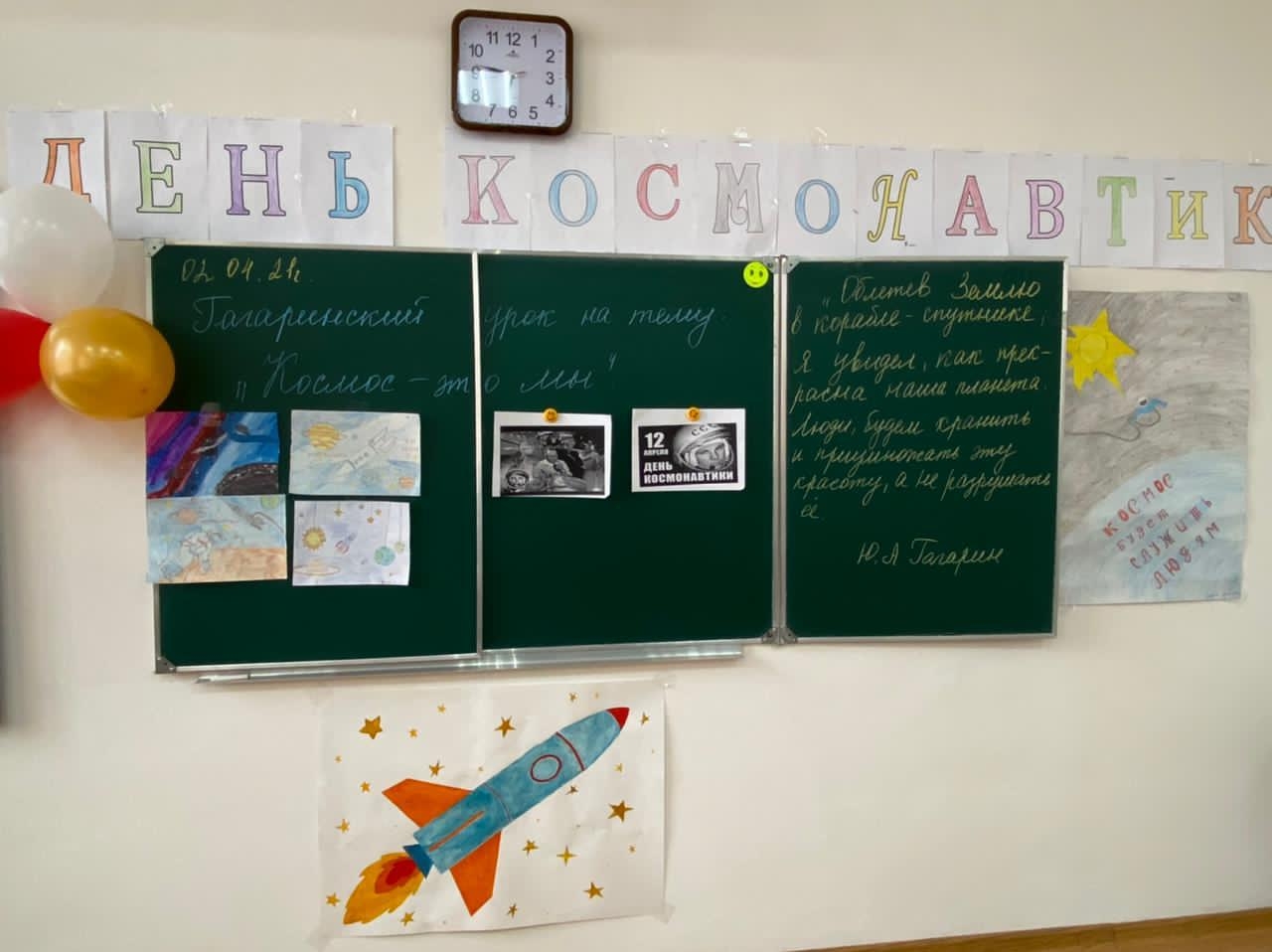 На уроке демонстрировалась компьютерная презентация «Знаете ,каким он парнем был?» ,звучали песни о космосе, о космонавте. Было подобрано много фотографий, иллюстраций связанных с именем Гагарина. Под космическую музыку ученики совершили необычное путешествие во Вселенную, нарисовали рисунки на выставку.