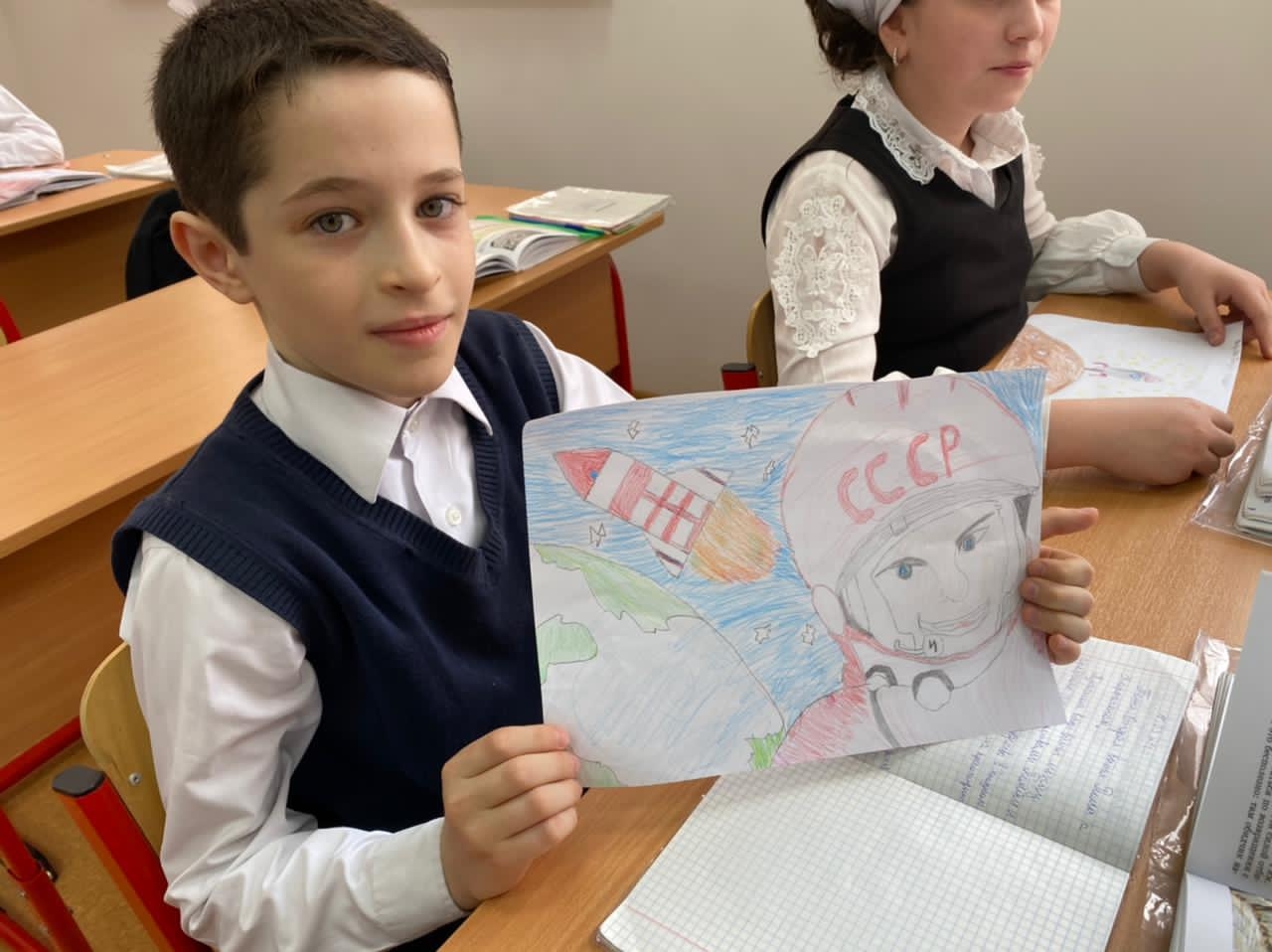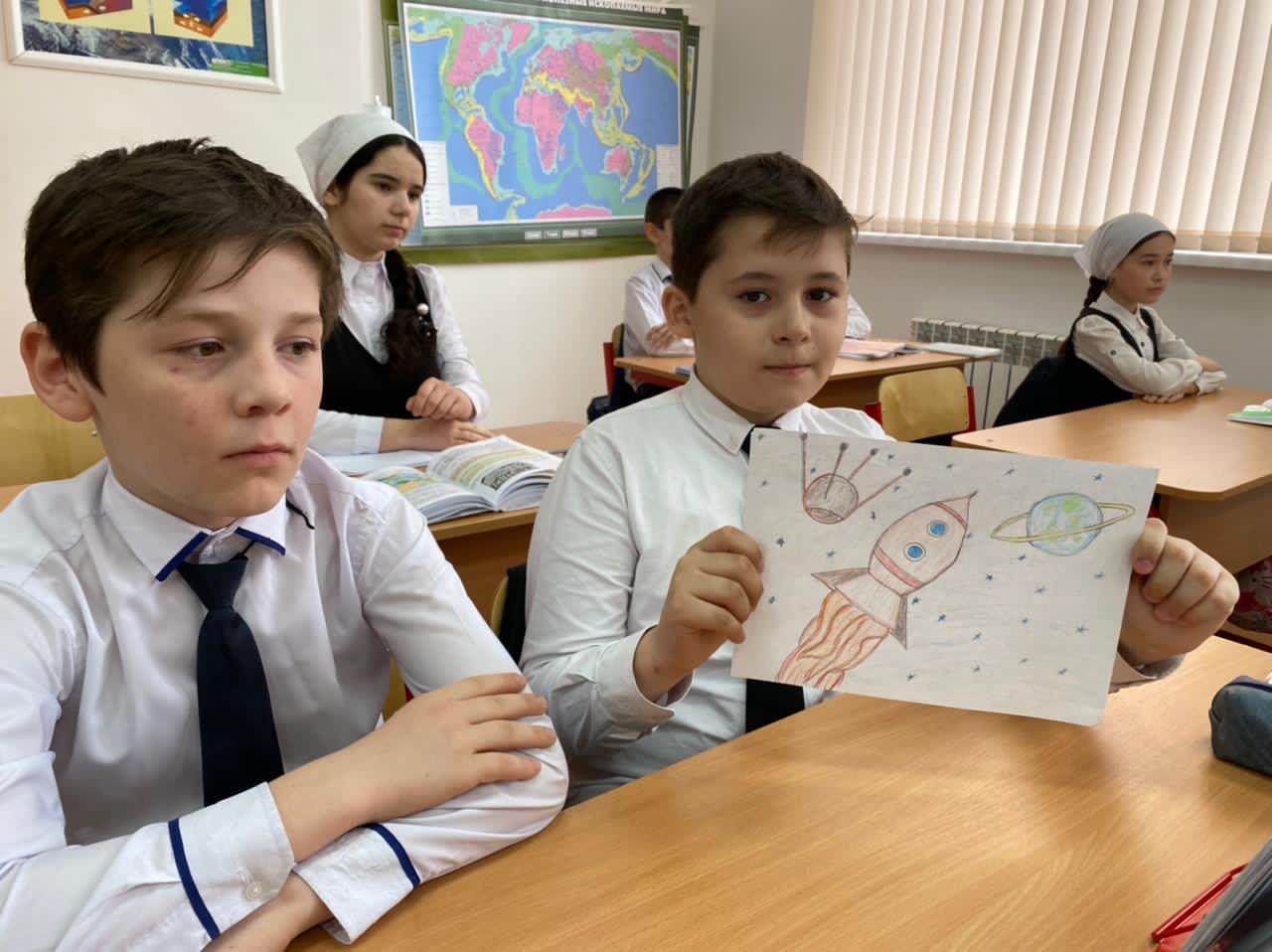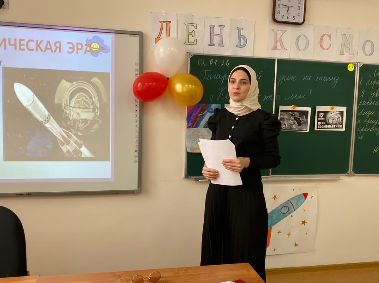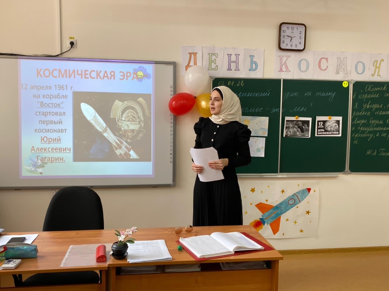На уроке демонстрировалась компьютерная презентация «Знаете ,каким он парнем был?» ,звучали песни о космосе, о космонавте. Было подобрано много фотографий, иллюстраций связанных с именем Гагарина. Под космическую музыку ученики совершили необычное путешествие во Вселенную, нарисовали рисунки на выставку.