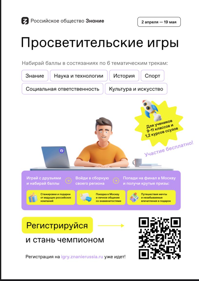 Со 2 по 30 апреля в стране проходит региональный этап первых Всероссийских просветительских игр для старшеклассников, которые организованы Российским обществом «Знание» при поддержке Министерства просвещения РФ. Это интеллектуально-спортивные соревнования, направленные на всестороннее развитие личности, которые дают возможность молодым людям попробовать свои силы в решении разных задач, сформировать привычку постоянно развиваться и учиться, мотивируют их на поиск новых знаний и добрые дела.