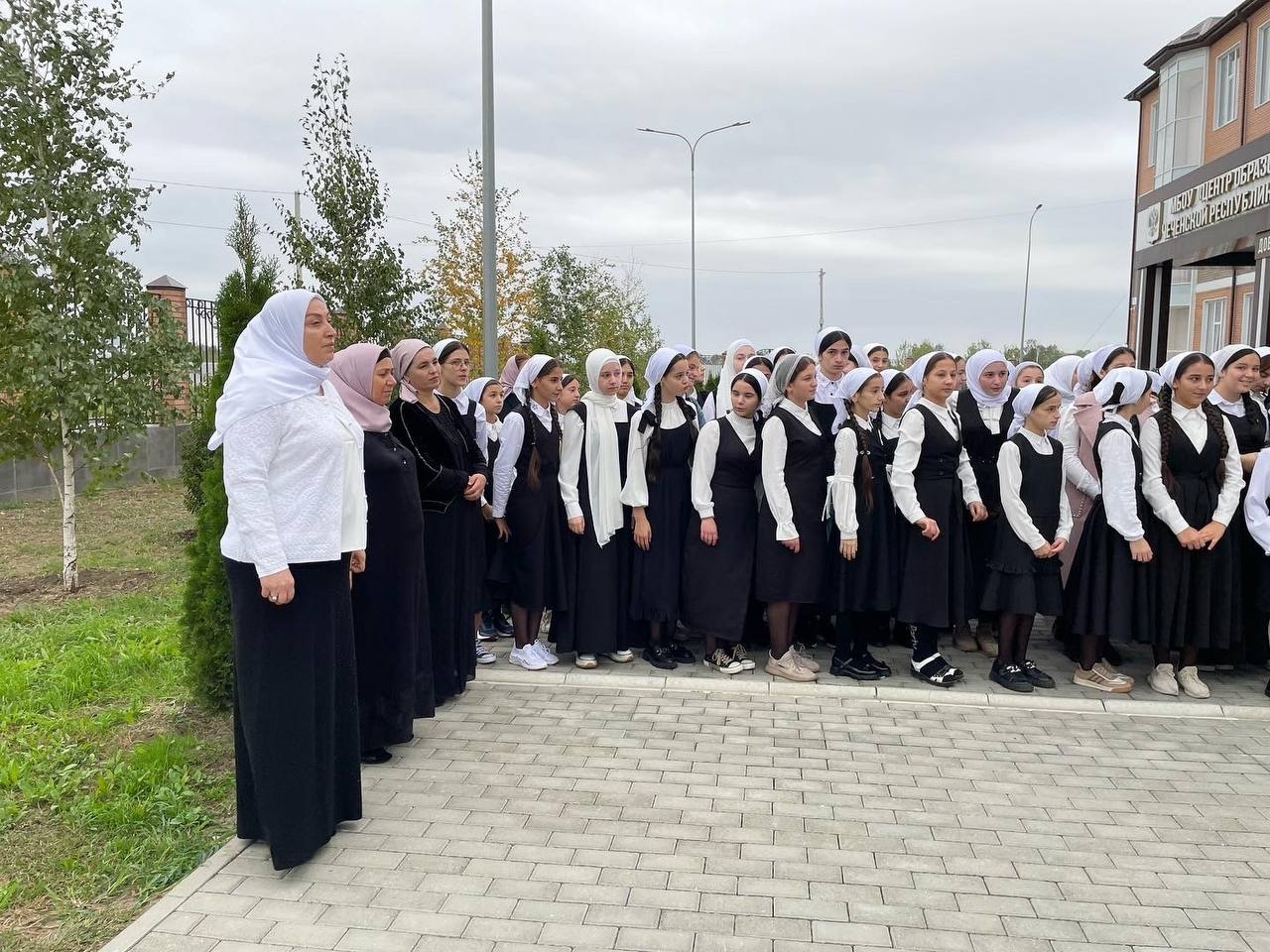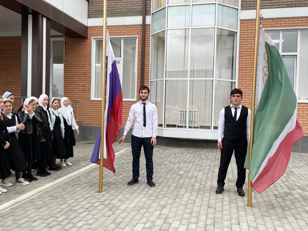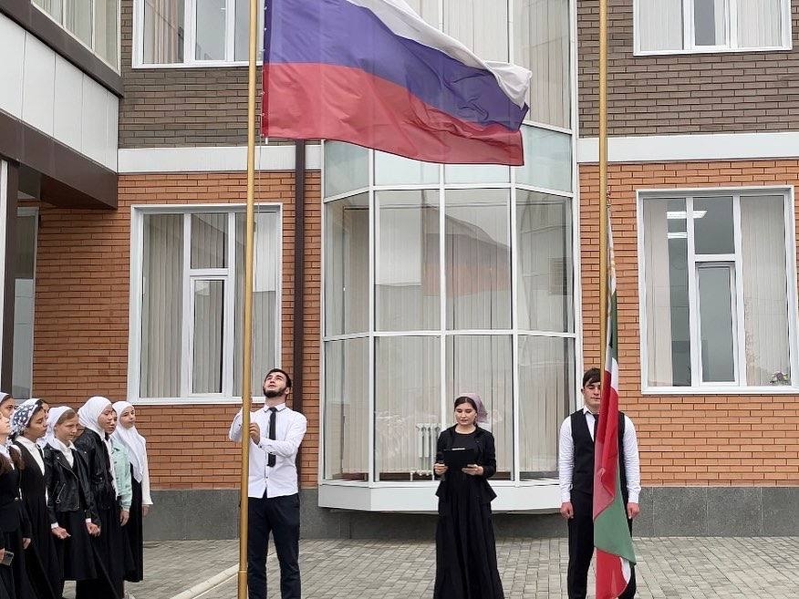 В МБОУ «ЦО г.Аргун им.А.-Х.Кадырова» по традиции учебная неделя началась с поднятия флагов Российской Федерации и Чеченской Республики.