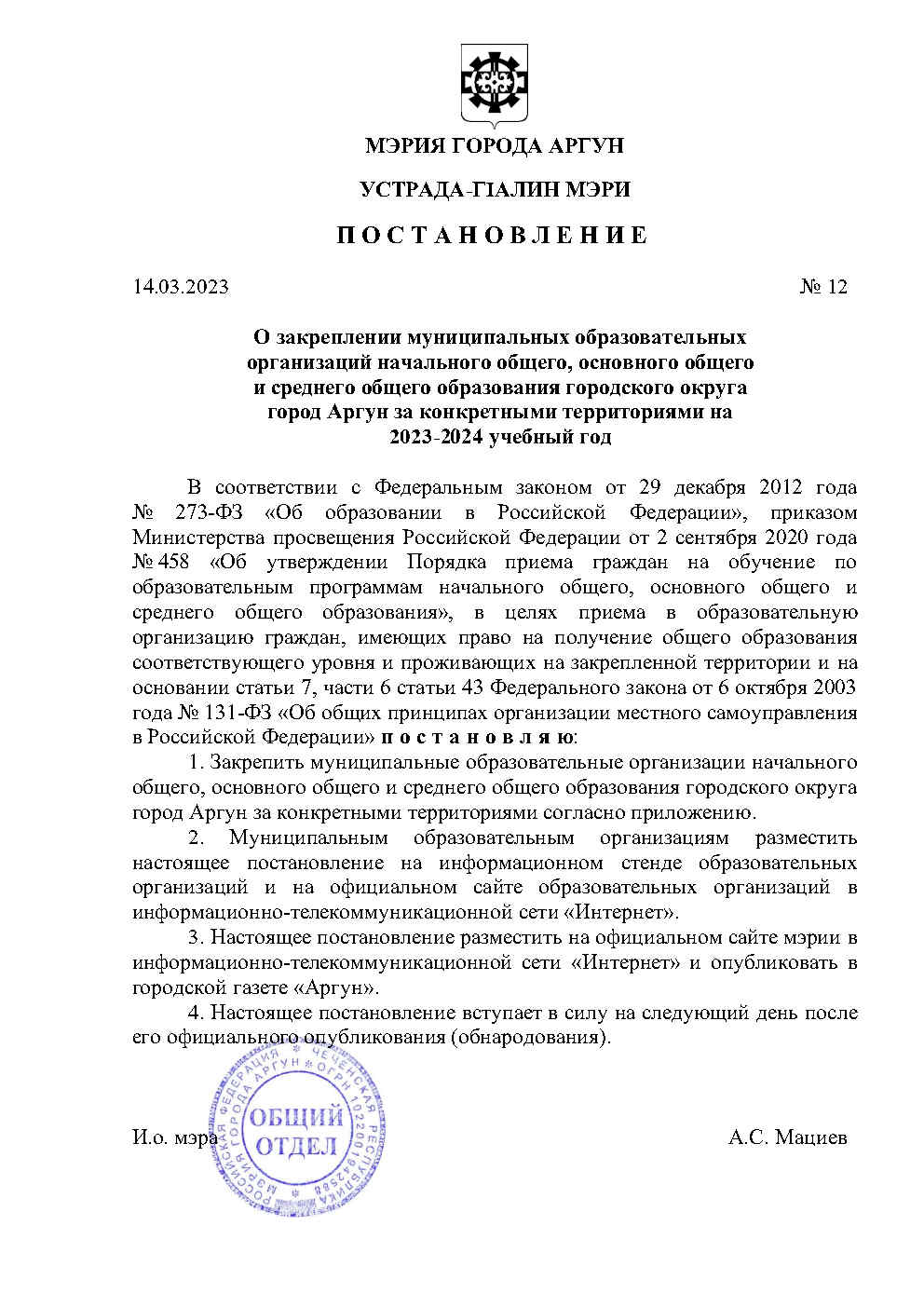 03.05.2023О закреплении муниципальных образовательных организаций начального общего, основного общего и среднего общего образования городского округа город Аргун за конкретными территориями на 2023-2024 учебный