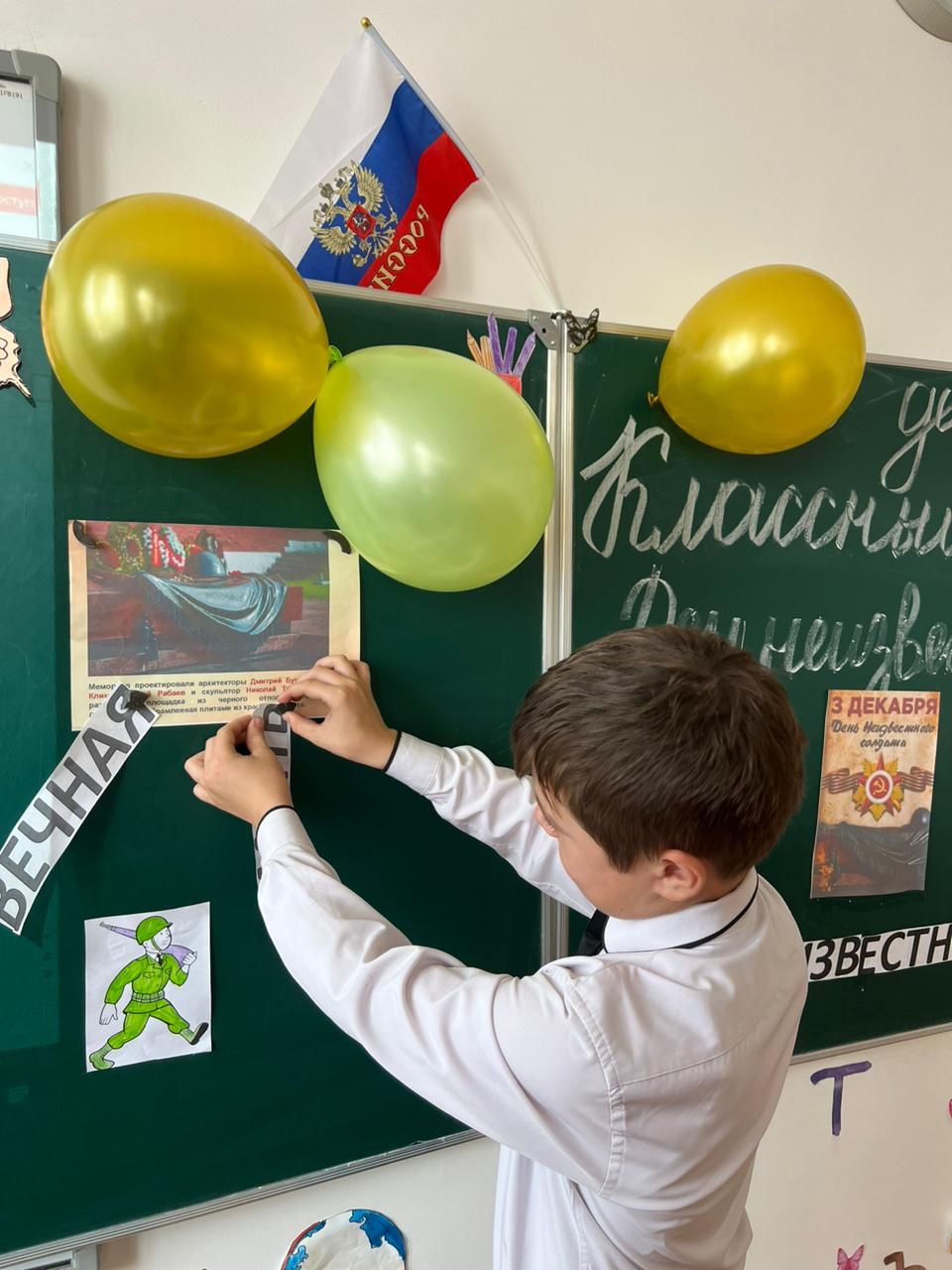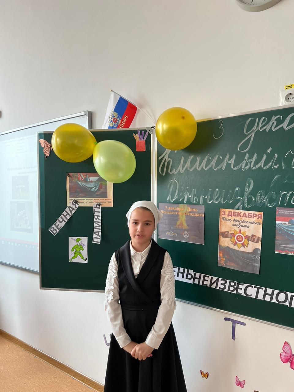 В МБОУ «ЦО г.Аргун им.А-Х.Кадырова» советник директора по ВР Бахаева Х. совместно с классными руководителями провели открытые классные часы, посвященные "Дню Неизвестного солдата". Эта важная дата установлена Указом Президента РФ для увековечения памяти, воинской доблести и бессмертного подвига наших воинов. Надпись на плите, лежащей на могиле Неизвестного солдата – «Имя твое неизвестно. Подвиг твой бессмертен» - завет помнить о тех, кто ценой своей жизни защитил Отечество, подарил нам счастье мирной жизни. Классные руководители рассказали о значении этого дня, о том, что нельзя забывать о подвигах солдат, защищавших Родину. О том, что поисковые отряды до сих пор возвращают имена солдатам, принося покой родственникам, пропавших без вести.