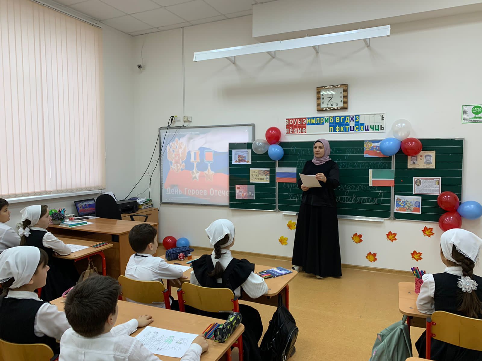 В МБОУ «ЦО г.Аргун им.А.-Х.Кадырова» советник директора по ВР Бахаева Х. совместно с классными руководителями организовали и провели открытые мероприятия, посвященные Дню Героев Отечества.