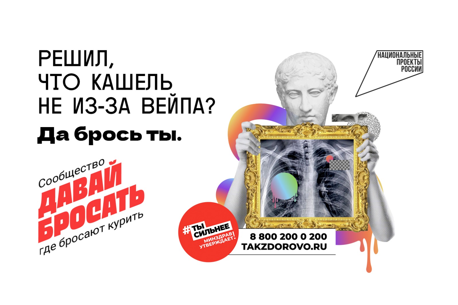 1 мая по нацпроекту «Демография» АНО «Национальные приоритеты» совместно с Минздравом России запустило коммуникационную кампанию «Электронные сигареты и что они скрывают». Рекламные баннеры побуждают людей задуматься, так ли безопасны электронные сигареты для здоровья и какие последствия для организма может спровоцировать курение. Решил, что кашель не из-за вейпа? Считаешь, что курение электронных сигарет не вредно и это просто «клубничный пар»? Да брось ты. Баннеры можно будет увидеть на поверхностях наружной рекламы в 29 городах, включая 16 городов-миллионников. Кроме того, с 20 мая роботизированный голос на радио напомнит слушателям, что электронные сигареты ничем не лучше. Табак там не горит, а электронно нагревается, но почему-то с сосудами начинаются проблемы. «Коммуникационная кампания позволит усилить эффект мер, направленных на борьбу с никотиновой зависимостью. По опросу ВЦИОМ 68% респондентов в декабре 2023 года отметили, что не курят, перестали курить или курят меньше. Показатель вырос на 20% по сравнению с декабрем 2020 года. Мотивация людей вести здоровый образ жизни – приоритет национального проекта «Демография». В регионах работают центры здоровья, где специалисты проводят консультации по отказу от курения. Кроме того, поддержку можно получить в сообществе «Давай бросать» в социальной сети Вконтакте и мессенджере Телеграм», - отметила генеральный директор АНО «Национальные приоритеты» София Малявина. Электронные сигареты, вейпы и иные продукты нагревания табака в последнее время завоевали огромную популярность, особенно среди молодёжи. Это происходит, в том числе, благодаря хорошим маркетинговым стратегиям. Сообщество бросающих помогает сформировать здоровое комьюнити в социальных сетях, где «парильщиков» поддерживают в решении бросить курить, а также каждый может получить советы профильных специалистов и полезные лайфхаки, как сделать это быстро и эффективно. Сейчас сообщество единомышленников, решившихся отказаться от зависимости, насчитывает более 55 тыс. участников. В группах можно найти истории тех, кто уже отказался от курения, полезные советы и практики по отказу от зависимости – но главное – это поддержка и единство всех желающих стать свободными от этого пагубного занятия. Присоединиться к сообществу «Давай бросать» можно в социальной сети «Вконтакте» и мессенджере «Телеграм»: https://t.me/davaibrosat https://vk.com/davaibrosat