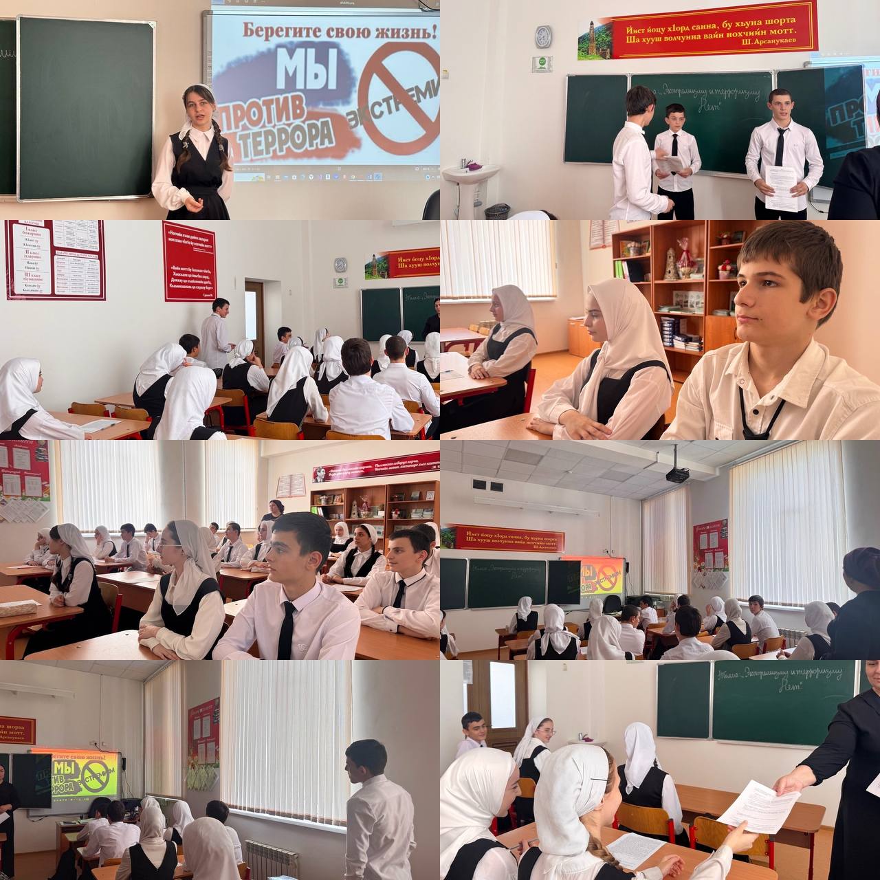 В МБОУ «ЦО г.Аргун им.А.-Х.Кадырова» проведены классные часы на тему «Терроризму и экстремизму нет!». Учащиеся посмотрели презентации и видеоролики, посвященные этой теме.